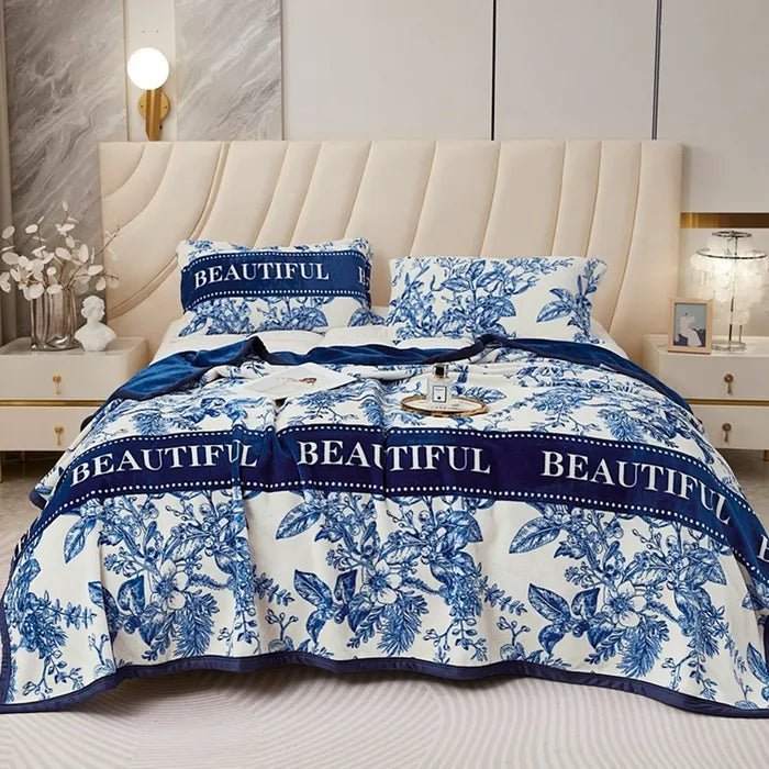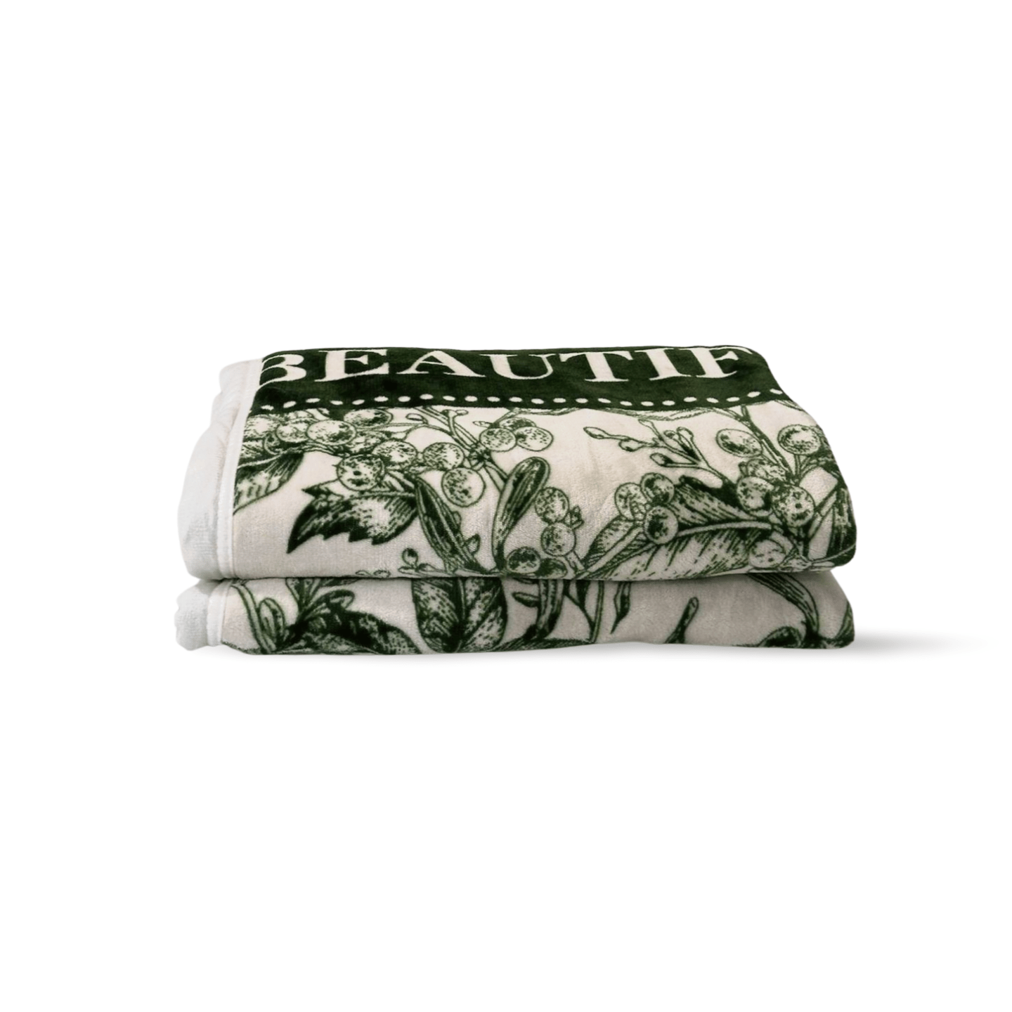 - Elegant Design: The blanket’s botanical patterns, available in blue or green, depict delicate leaves, branches, and flowers, adding a touch of nature’s beauty to your space. The bold "BEAUTIFUL" message in white across the blanket adds an inspirational touch to your decor.
